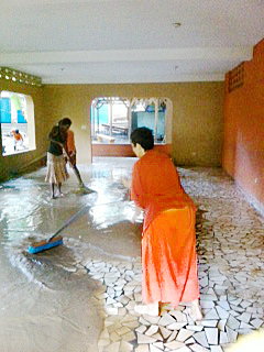 Weather was a hot topic–with the rainy season upon us, flooding and cholera are constant worries. The days were beautiful: brilliant blue sky, warm weather and lots of flowering trees. The nights were a bit more dramatic: ear-splitting thunder storms shook the house for minutes at a time and torrential rains flooded our ground floor school each morning. Many nights were sleepless as we took turns patrolling to make sure the river did not flood our second floor and put the kids at risk.
